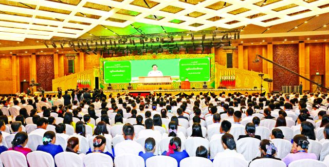 ပြည်ထောင်စုသမ္မတမြန်မာနိုင်ငံတော် ယာယီသမ္မတ နိုင်ငံတော်လုံခြုံရေးနှင့် အေးချမ်းသာယာရေးကော်မရှင် ဥက္ကဋ္ဌ ဗိုလ်ချုပ်မှူးကြီး မင်းအောင်လှိုင် နှင့်ဇနီး ဒေါ်ကြူကြူလှ ၂၀၂၄ ခုနှစ်အတွက် အမျိုးသားစာပေတစ်သက်တာဆု၊ အမျိုးသားစာပေဆုနှင့် စာပေဗိမာန်စာမူဆု ဆုနှင်းသဘင်အခမ်းအနားသို့ တက်ရောက်၍ စာပေဆုများ ပေးအပ်ချီးမြှင့်
